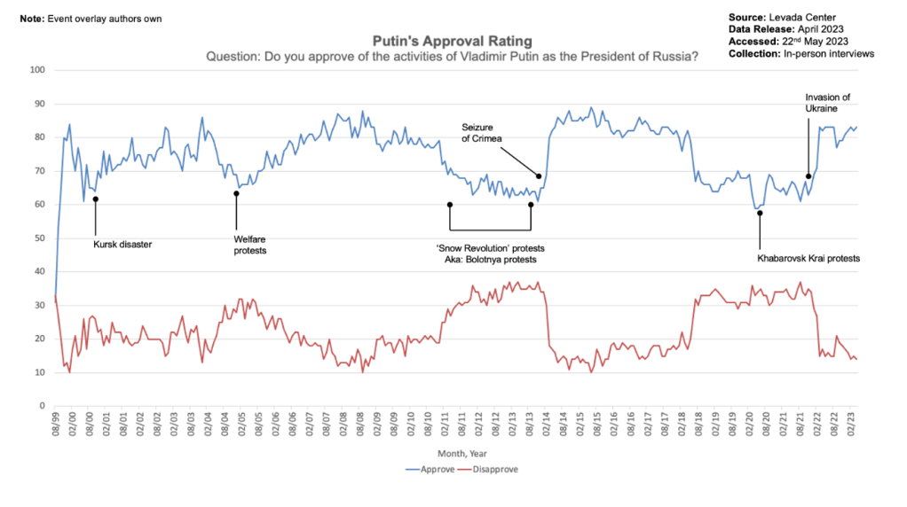 Since the February 2022 invasion, Putin and the Kremlin have intensified efforts to consolidate power and eviscerate the opposition. The police and FSB have arrested 20,467 protestors, while the state has made references to ‘war’ and criticism of the army illegal (Kolesnikov, 2023). In addition, over 700,000 citizens have left the Russian Federation (Forbes Russia, 2022), with Kolesnikov putting the numbers fleeing to Kazakhstan alone at 2.9 million (Kolesnikov, 2023), no doubt, to avoid mobilisation, but much to the benefit of the Kremlin, which has lost a vast swathe of Russia’s more liberal-leaning population.